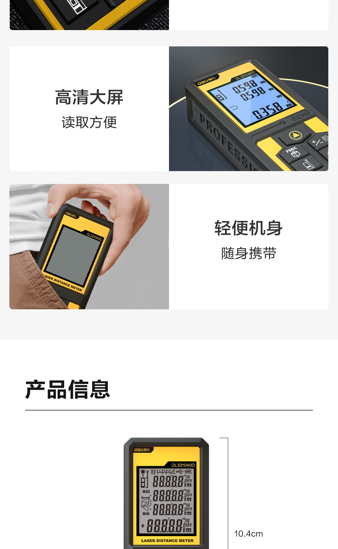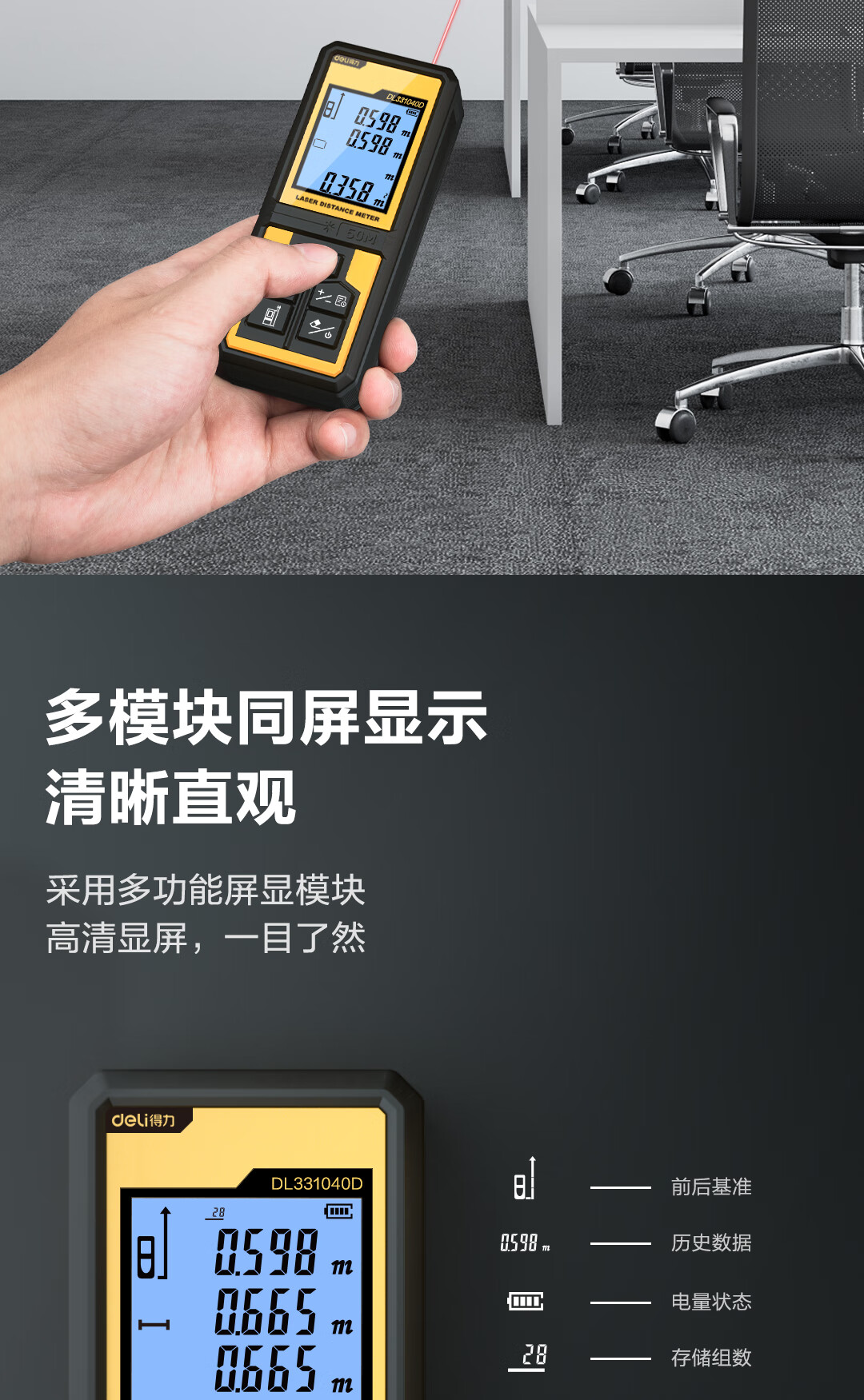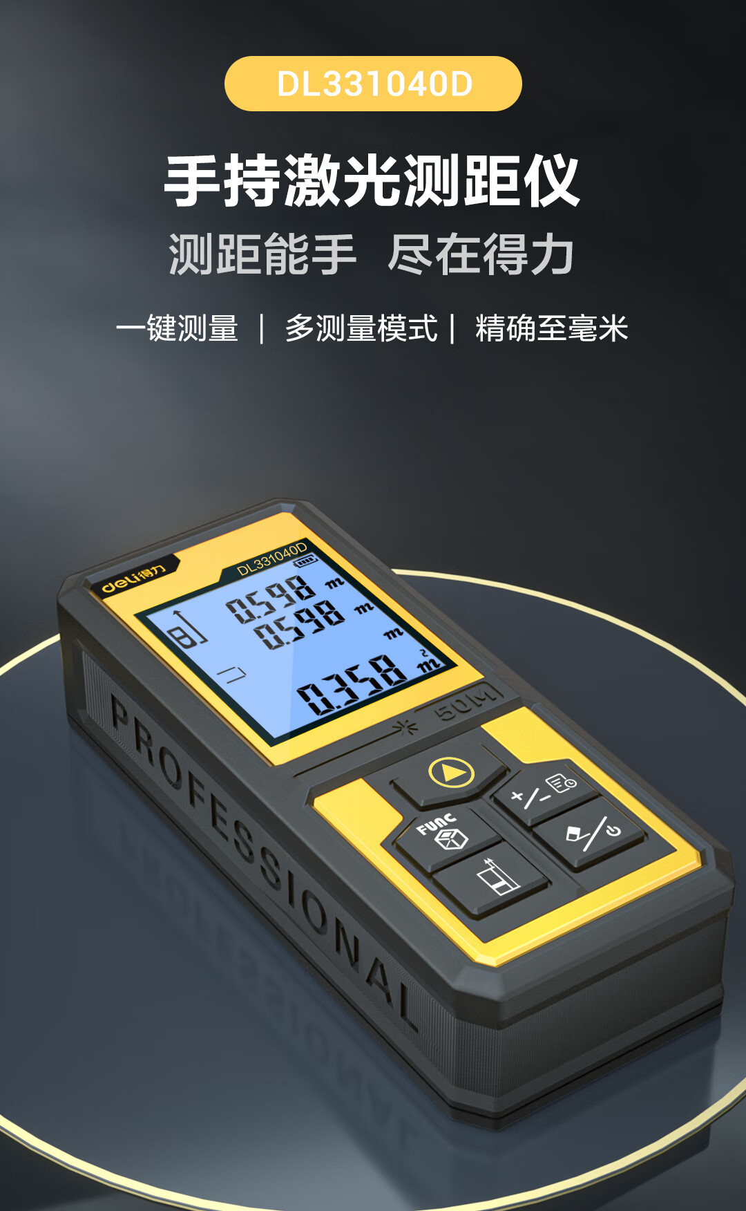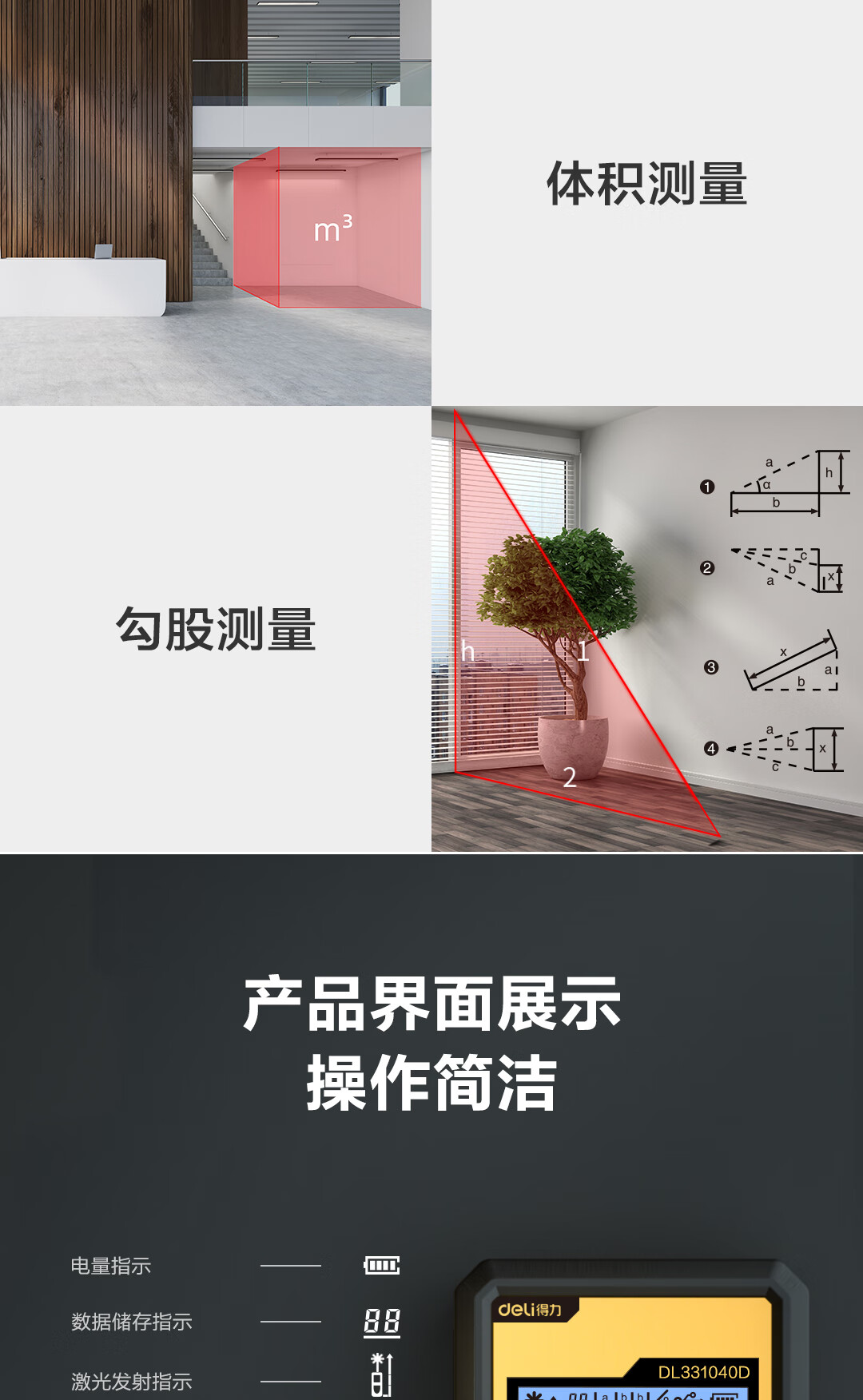商品名稱:得力DL331040D 測(cè)距儀 手持式激光高精度電子尺紅外量房?jī)x50米量程毫米級(jí)精度