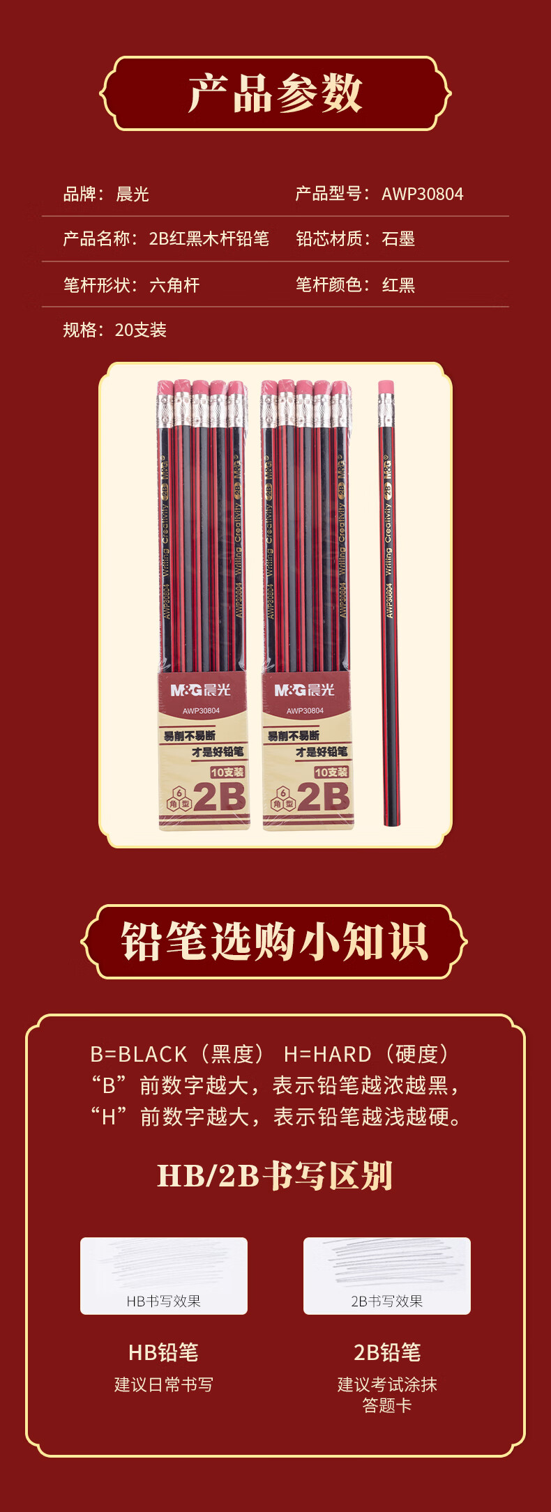 商品名稱:晨光AWP30804 2B鉛筆 20支紅黑抽條六角木桿鉛筆 學(xué)生書寫美術(shù)素描繪圖木質(zhì)鉛筆帶橡皮頭