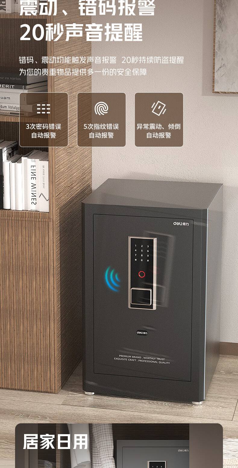 商品名稱:得力AE66-ZM 保險(xiǎn)柜 家用指紋密碼保險(xiǎn)箱辦公小型保密箱可入墻入柜保險(xiǎn)箱床頭保管箱 60cm曜巖黑 弘雅系列
