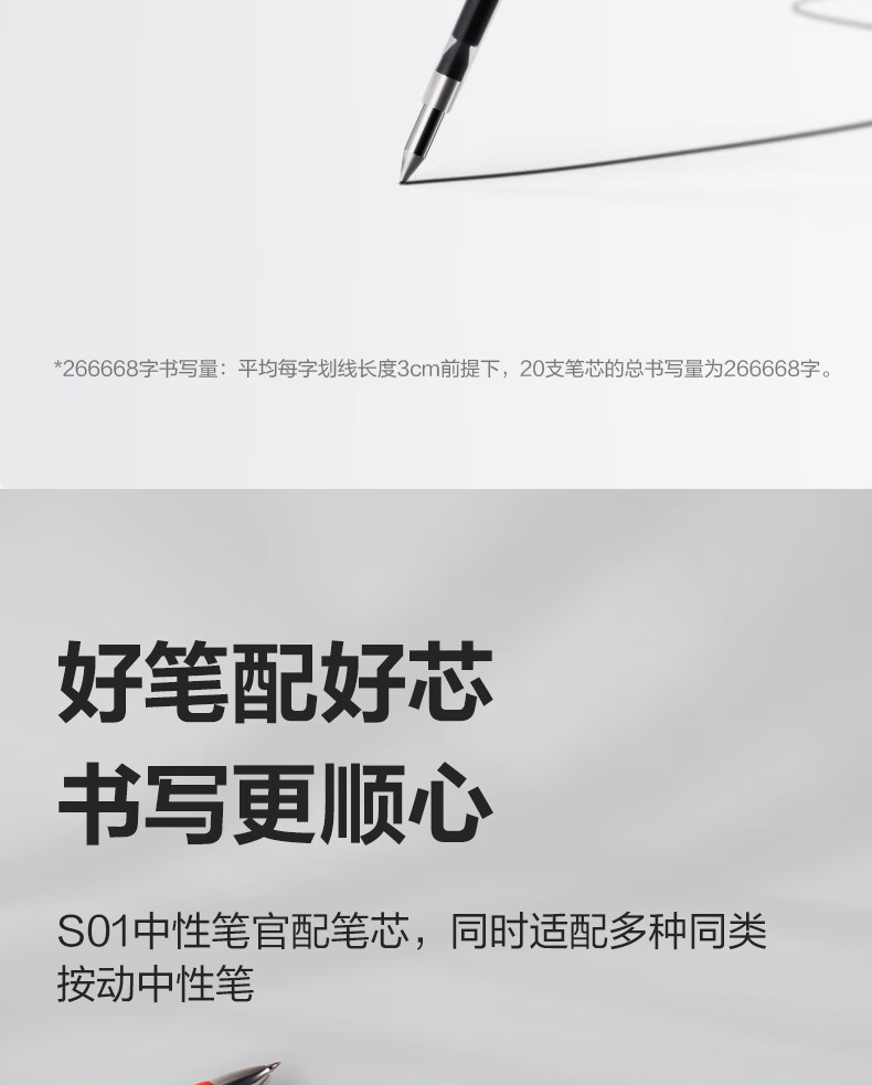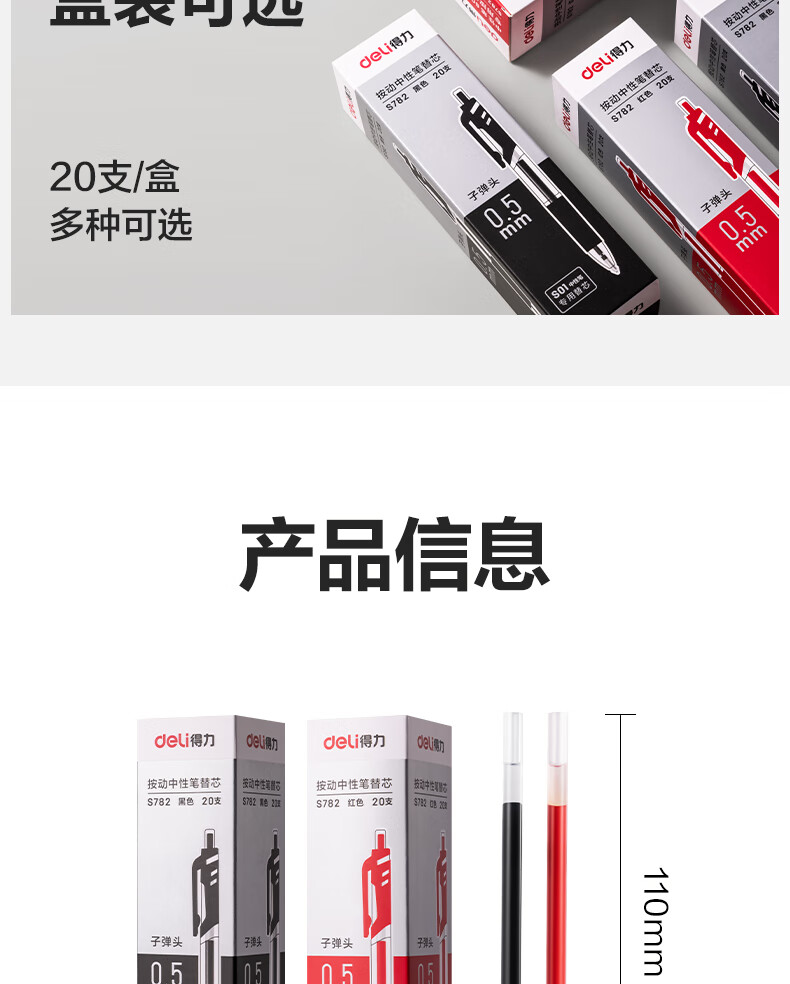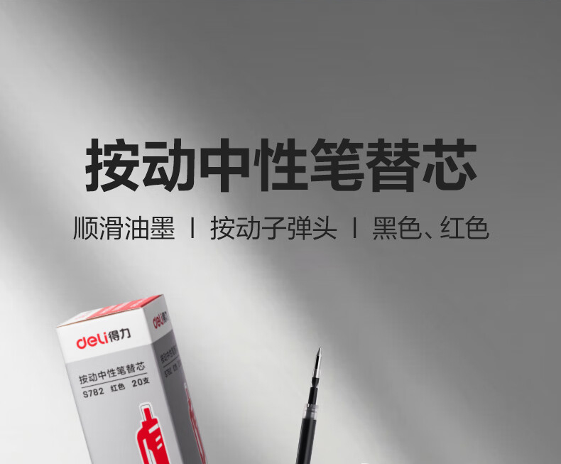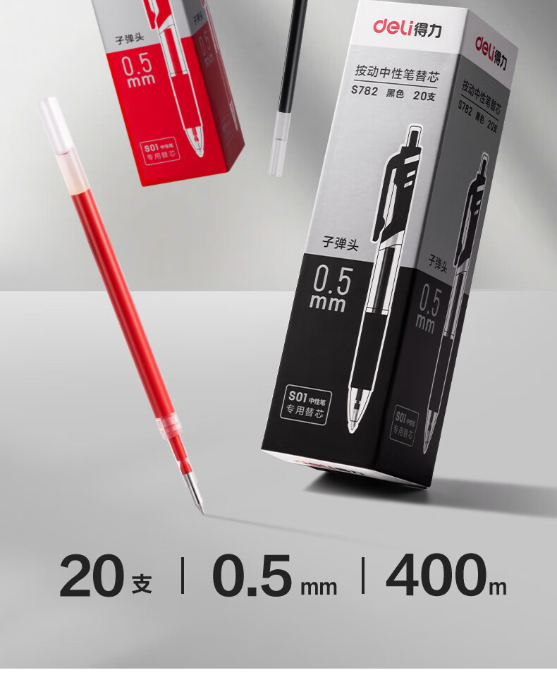 商品名稱:得力S782 按動中性筆芯替芯 S01/S08/1008/K35適用 0.5mm子彈頭 20支/盒 辦公用品