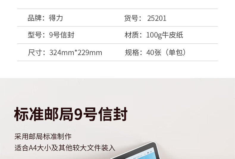 商品名稱:得力25201 牛皮紙大信封 9號A4郵局標(biāo)準(zhǔn)信封229*324mm 40張/包