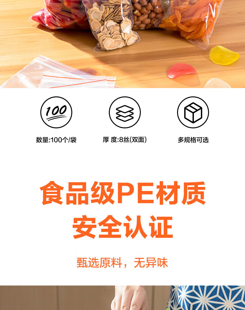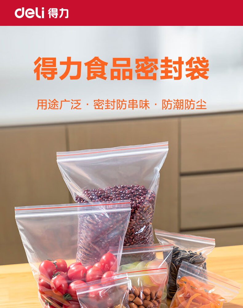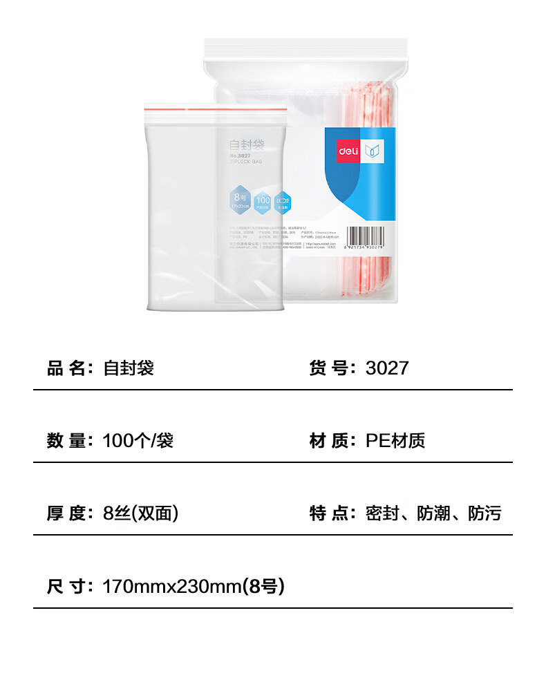 商品名稱:得力3027 食品密封袋 8號23*17cm 防水防塵保鮮收納PE透明 100只/包