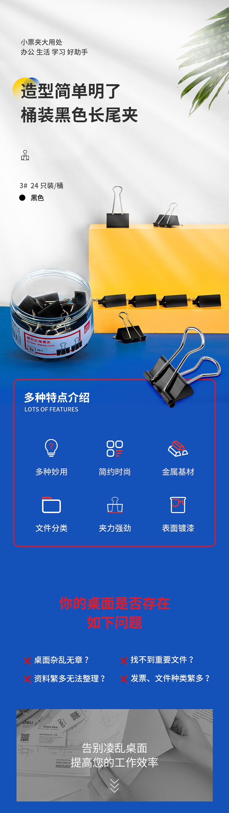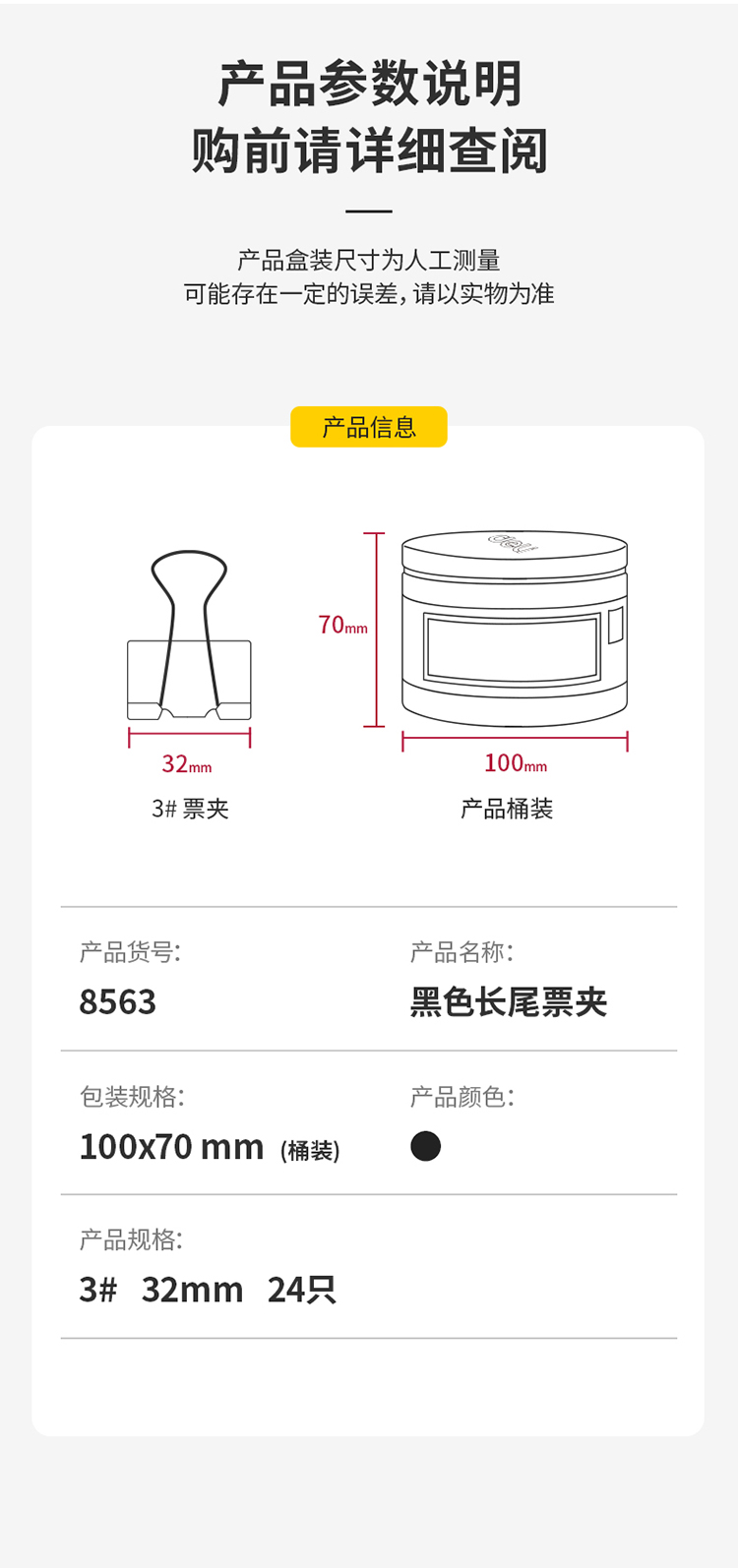商品名稱:得力8563 黑色長(zhǎng)尾夾 32mm中號(hào)金屬燕尾夾票據(jù)文件夾子 24只/筒
