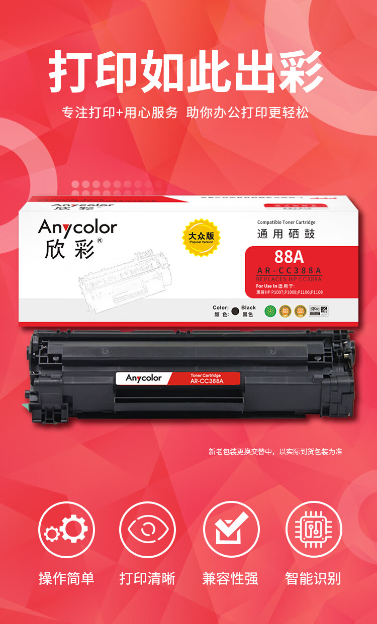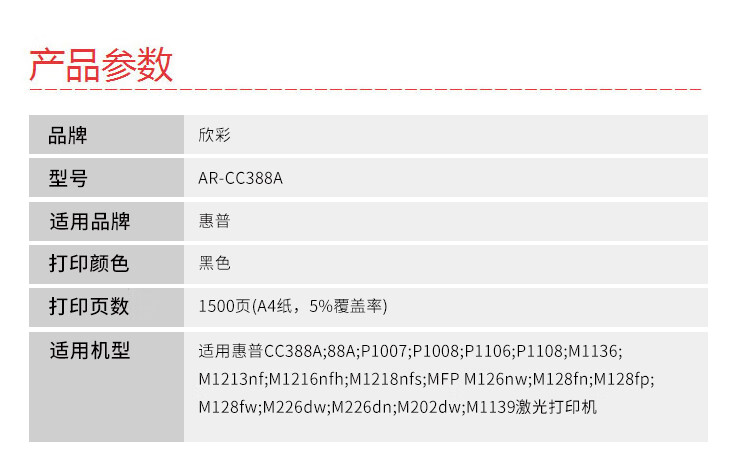 商品名稱:欣彩AR-CC388A大眾版硒鼓 適用惠普CC388A HP P1007 1008 M128fn 黑色 1500頁(計(jì)價(jià)單位:支)