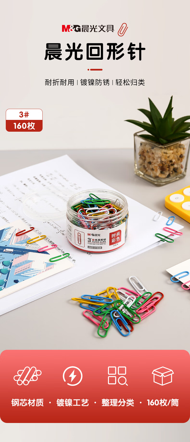 商品名稱(chēng):晨光ABS91698 彩色回形針 3#防銹多功能曲別針 160枚/筒