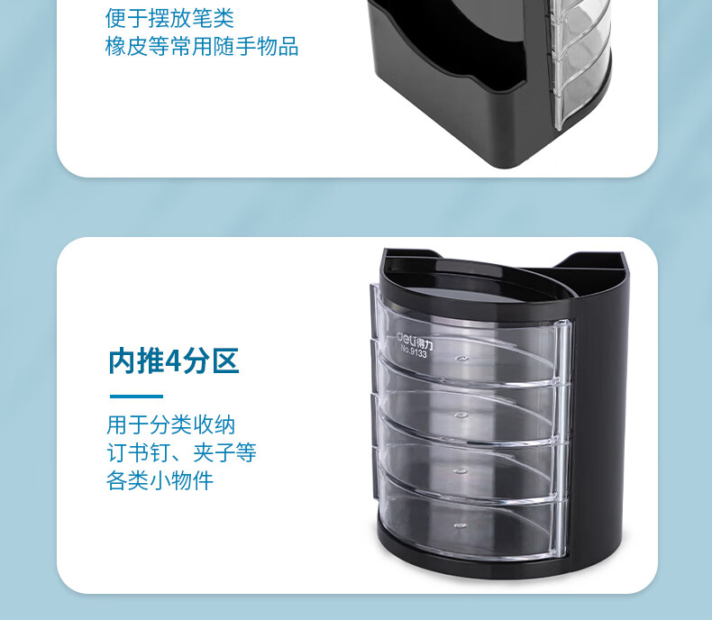 商品名稱:得力9133 四層多功能黑色筆筒 商務辦公桌面文具收納盒 單個裝
