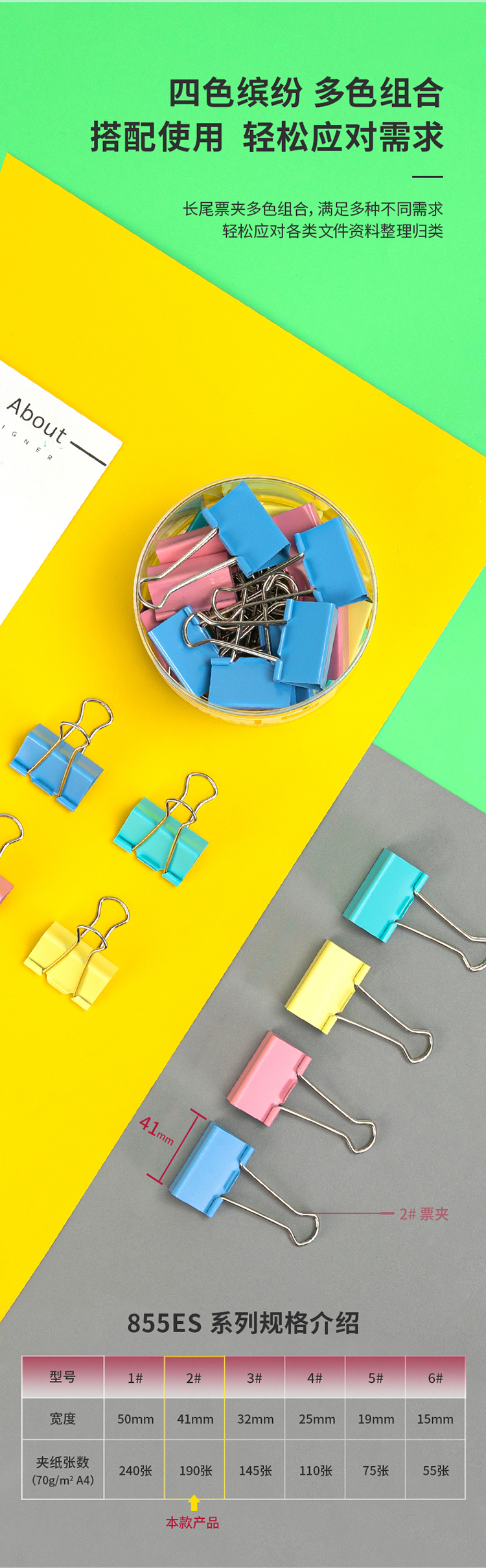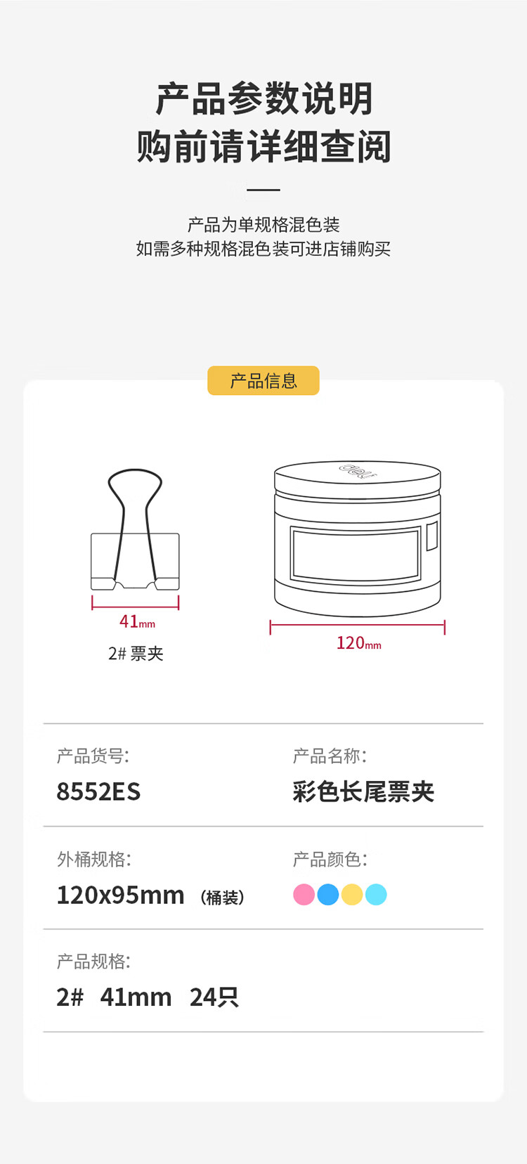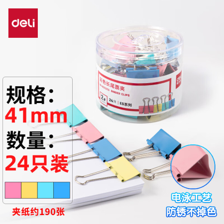 商品名稱:得力8552ES 彩色長尾夾 2#41mm大號金屬票夾燕尾夾票據(jù)文件夾子 辦公用品 24只/筒