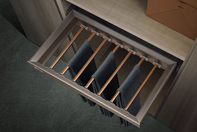 加厚防滑掛桿設(shè)計,桿距自由調(diào)節(jié),拿取便捷,增大收納空間; 讓您的褲子收納井井有序,保持熨燙之后的平整;獨具匠心的隱藏式緩沖滑軌設(shè)計,賦予您優(yōu)雅靜謐的高貴生活。